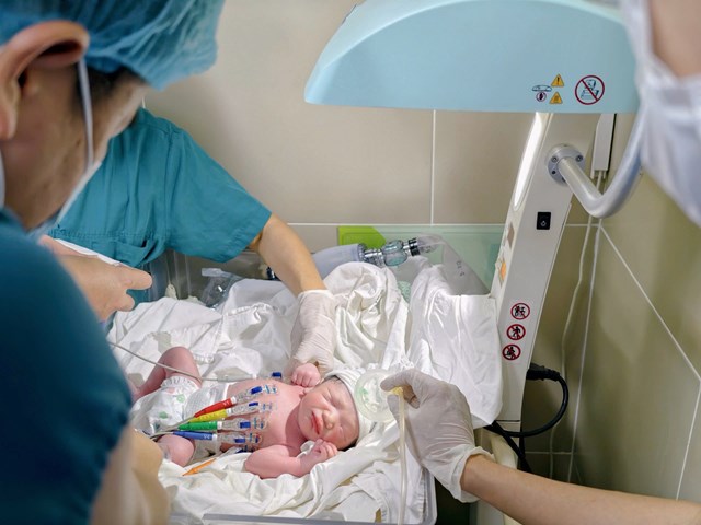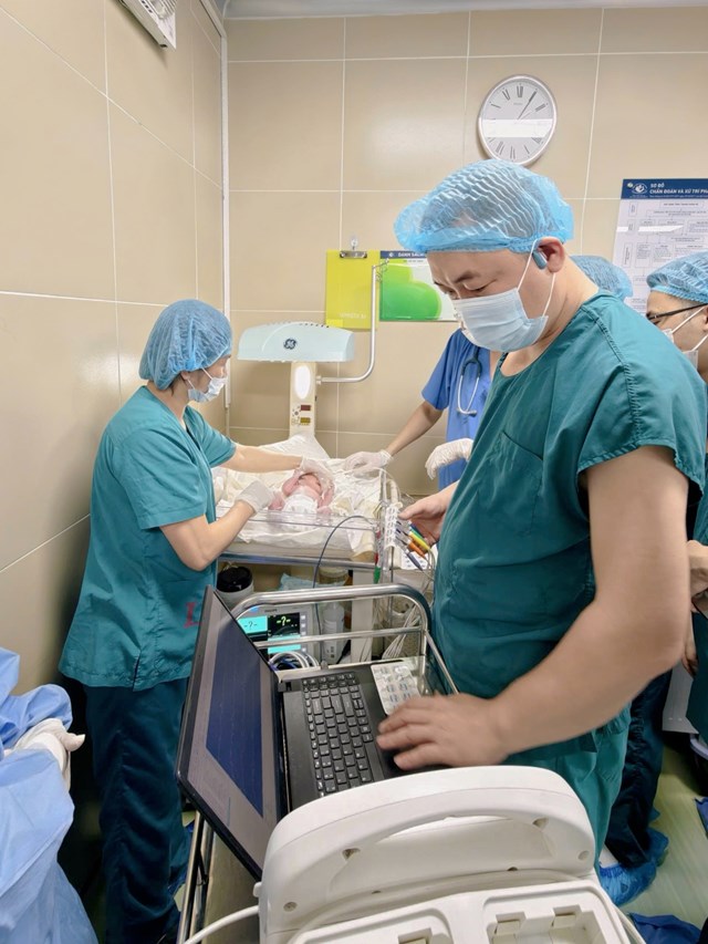 Qua quá trình theo quan sát liên tục, khi các chỉ số chuyên môn cho thấy việc tiếp tục kéo dài thai kỳ không còn đảm bảo an toàn cho thai nhi, các bác sĩ đã hội chẩn, chỉ định mổ lấy thai chủ động ở thời điểm 36 tuần 4 ngày. Ca mổ do BSCKII Đỗ Xuân Vinh – Phó Giám đốc Bệnh viện Phụ Sản Hà Nội, phụ trách Khoa Sản bệnh A4 trực tiếp thực hiện, cùng ê-kíp phẫu thuật Khoa Sản bệnh A4 và các bác sĩ Khoa Hồi sức gây mê. Ca phẫu thuật được triển khai khẩn trương tại phòng mổ Khoa D5 – Bệnh viện Phụ sản Hà Nội. Ngay sau khi chào đời, bé được nhanh chóng đánh giá và ổn định tình trạng tim mạch ban đầu trước khi chuyển tới Bệnh viện Nhi Trung ương để tiếp tục theo dõi và điều trị chuyên sâu.