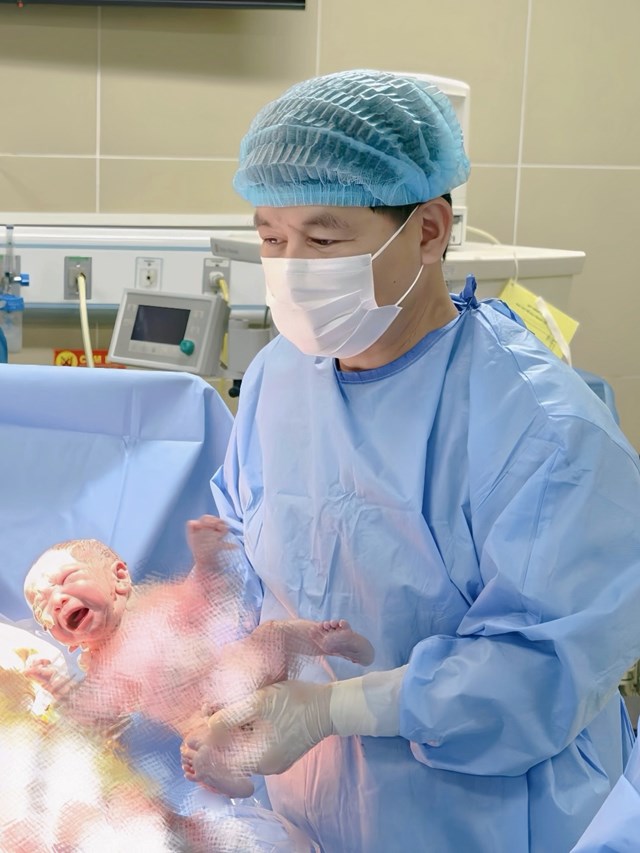 Ảnh: BSCKII Đỗ Xuân Vinh - Phó giám đốc Bệnh viện Phụ Sản Hà Nội, phụ trách Khoa Sản bệnh A4 trực tiếp thực hiện ca mổ và đón em bé chào đời nặng 2750gr