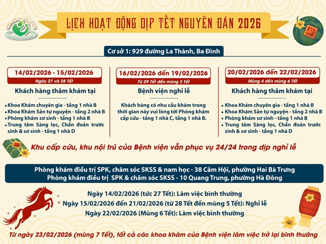 Bệnh viện Phụ Sản Hà Nội trân trọng gửi Quý khách hàng lịch hoạt động dịp Tết Nguyên đán năm 2026