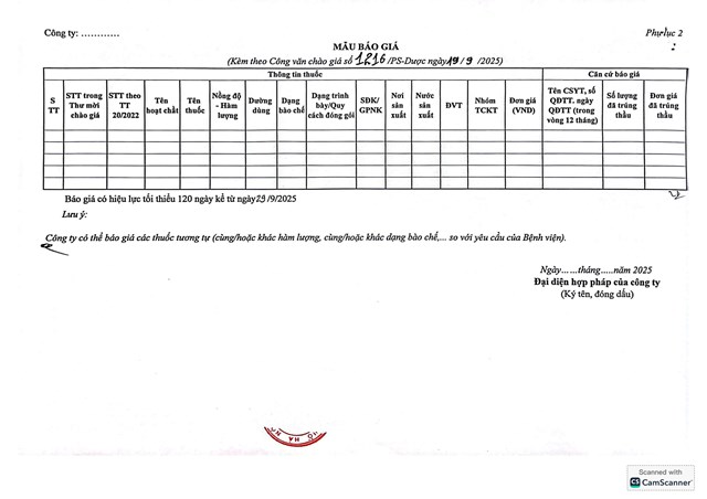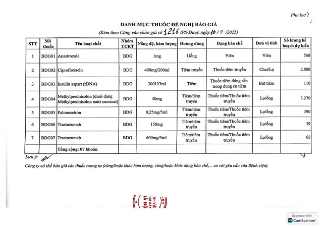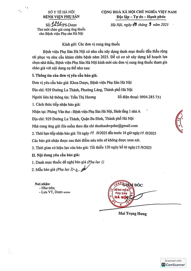 Thư mời chào giá cung ứng thuốc cho Bệnh viện Phụ Sản Hà Nội