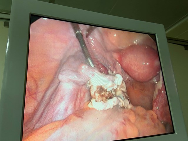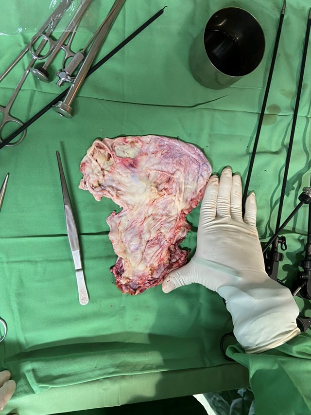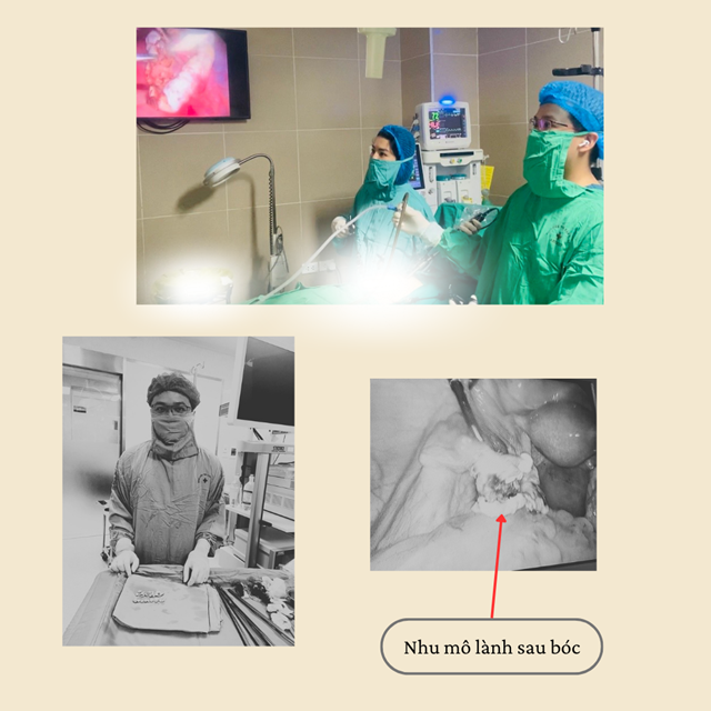 Thực hiện ca phẫu thuật là BSCKI. Phạm Hải Đăng, khoa Phụ ngoại. Trong quá trình phẫu thuật, ê-kíp đã phát hiện bệnh phẩm trong khối u chứa răng, xương, tóc… điển hình của một dạng u quái. Đây là loại u hiếm gặp, thường phát triển từ các tế bào mầm, chứa nhiều tổ chức bất thường. Việc lấy bệnh phẩm gặp nhiều khó khăn do khối u cứng, phức tạp, trong khi chỉ có thể đưa ra ngoài qua lỗ trocar nội soi khoảng 2cm.