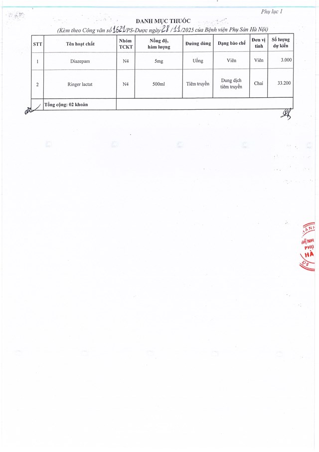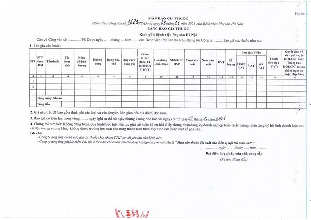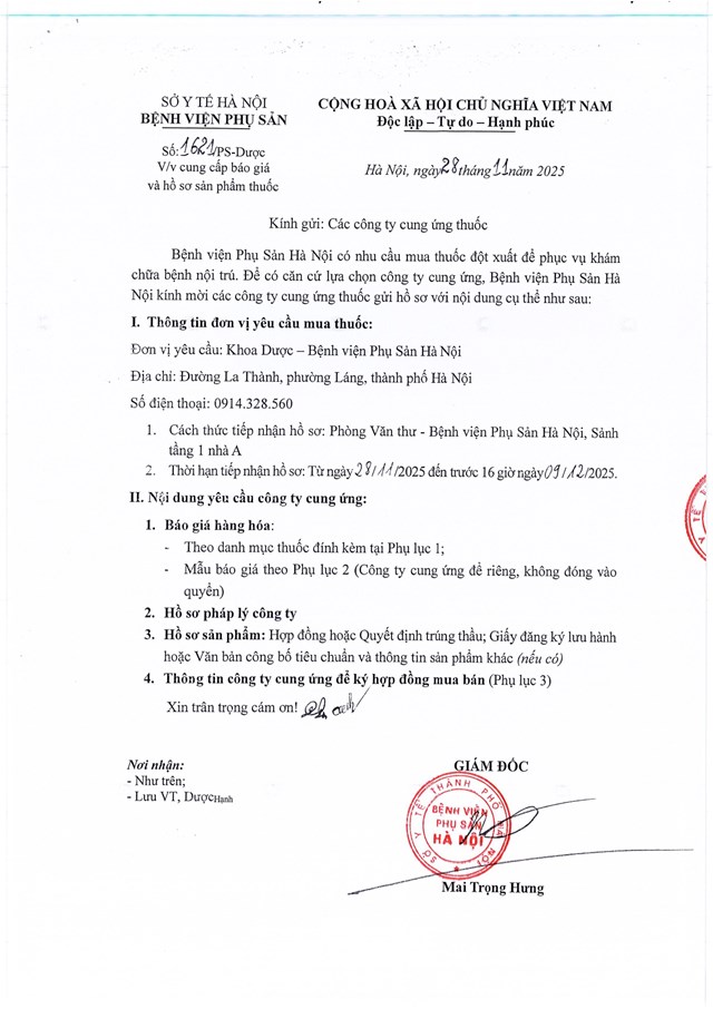 Thư mời chào giá cung ứng thuốc cho bệnh viện Phụ Sản Hà Nội