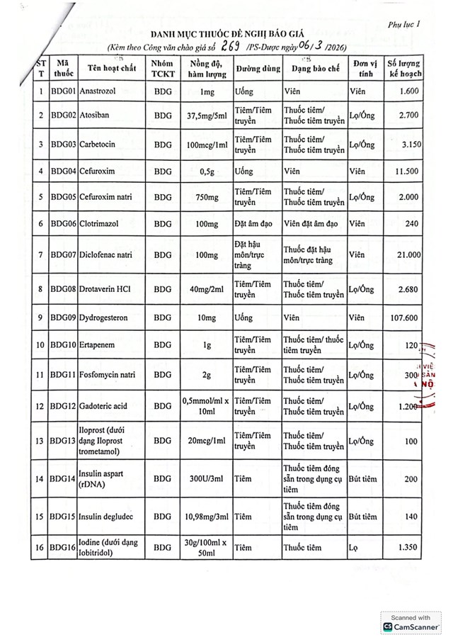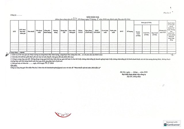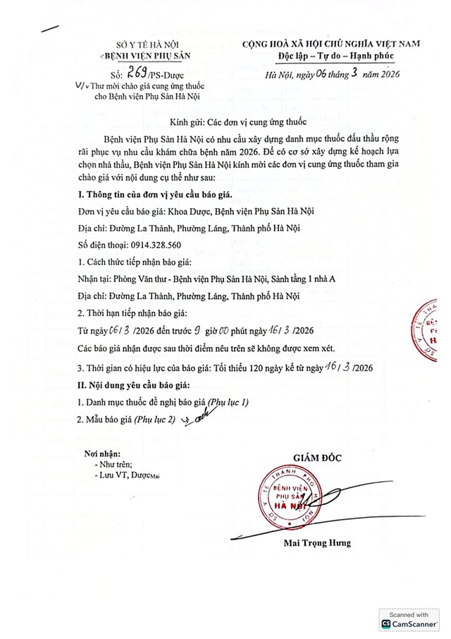 Thư mời chào giá cung ứng thuốc cho Bệnh viện Phụ Sản Hà Nội